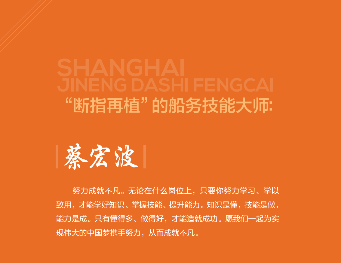 如今,在高端船舶修理领域,蔡宏波攻克了行业内维修禁区“主机遥控 系统”、船舶加宽加长改装等多个技术难点,被誉为拥有“断指再植”功夫 的技能大师。