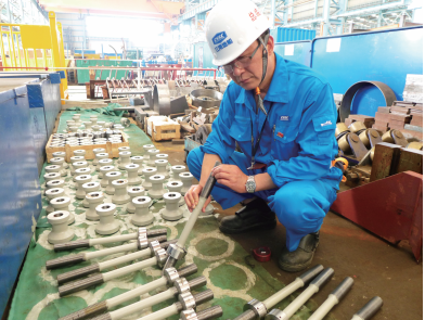 该船主船体采用低磁钢材,是新型高新产品。在主机组和 推力轴承螺栓孔钻孔过程中,当刃具进入到低磁钢区域时,切 削非常困难,刃具磨损严重,铰制螺孔的加工成了轴系设备安 装的最大难点。为此,他组织技术人员进行攻关,研究刃具的 选用、冷却液配方、钻孔设备转速控制、铰孔设备转速控制等, 做了大量的试验后,他专门设计制作了一套铰制螺孔加工工装, 使螺孔加工精度达到甚至超过了工艺图纸的要求。