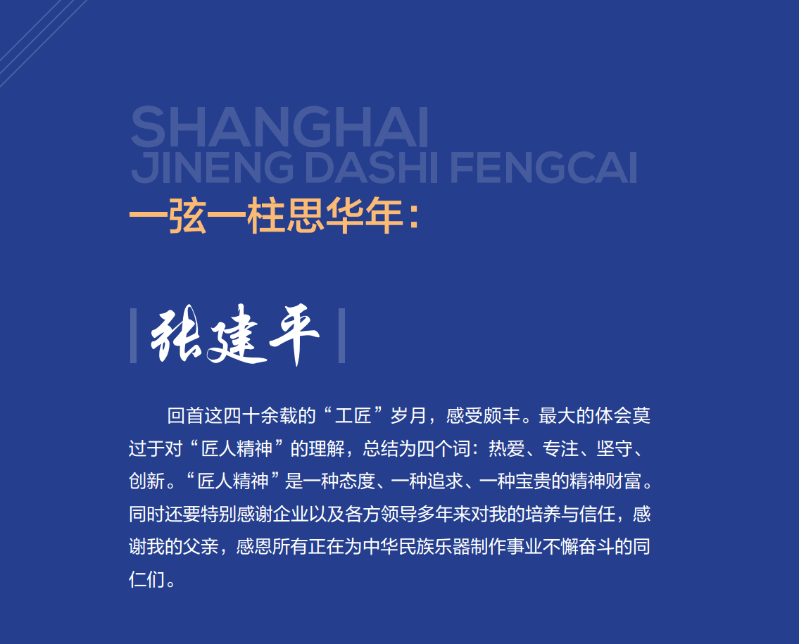 张建平说:“我父亲张龙祥是上海民族乐器一厂的乐器制作工艺师,他 是多面手,不仅擅长制作拉弦乐器,还喜欢动脑筋。他研制了三胡、琶琴、 新型阮等多种改良琴。我二伯父张文龙也是民族乐器一厂的工艺师,他最早 从事金属铜器制作工艺,金属制作工艺对精度的要求是很高的。”张建平说 二伯父张文龙转向乐器制作后,扎实的基本功运用于木料上面游刃有余。当年, 张文龙和张龙祥被誉为上海民族乐器一厂的“两条龙”。