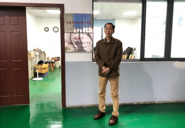 张建平技能大师工作室在上海民族乐器一厂二胡生产车间的一角,大约 30 平方米。一张约 2 米 ×4 米的长桌是他的工作台。长桌下面的工具箱里, 藏着他的全套“武器”——锉刀、刻刀、刨子……少说也有三四十种。张建 平今年刚好 61 岁,做了 41 年的民族乐器,可以说把自己一生最好的年华都 献给了民族乐器。经他手生产、调试的各类敦煌牌乐器不下千把。