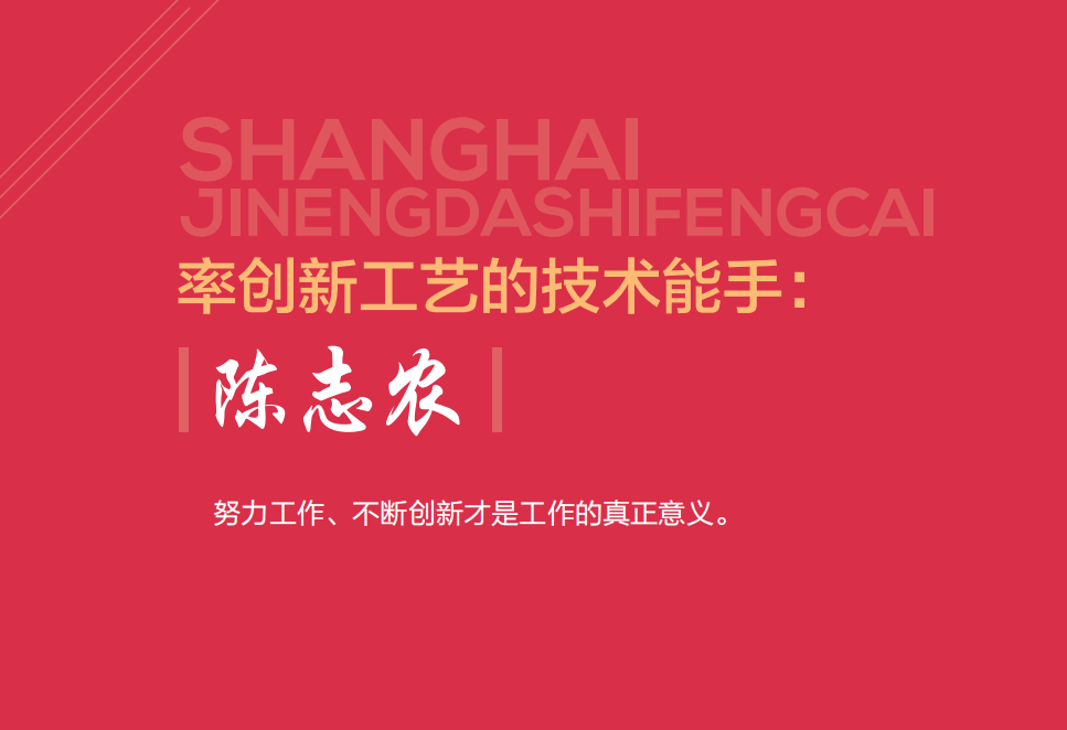 陈志农,男,1957 年 12 月出生,汉族,中共党员,江南造船集团船舶钳工高级技师,爱岗敬业,不断探索和创新,掌握了一套船舶轮机的安装、调试以及维修等技能。陈志农曾被评为上海市及中船总公司劳模、优秀技能标兵、船舶公司优秀党员、船舶工匠、全国技术能手、上海市十大工人发明家等。他凭借自己的经验,以高效、优质打造一流品牌的精神,为国防高新产品和高附加值的船舶建造,发挥了应有的作用,攻克了一个又一个难关。近 5 年来,他在船舶安装、调试中有所创新,有所发明,获得国家级专利 6 项,提出了多项新的工艺方案,在公司生产实际中得到了应用,填补了多项国内空白,并在 2012 年获得国务院政府特殊津贴。