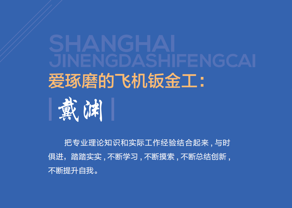 戴渊从一名普普通通的钣金工,成长为一名熟练掌握全面 钣金制造工艺技能和理论知识的高级技师,在平凡的岗位上, 走出了不凡的技术工人成长之路,成为了名副其实的“金蓝领”。 首席技师究竟是怎样炼成的,这其中的甘苦恐怕只有戴渊自己 才能体会。