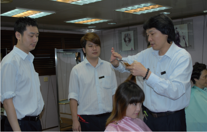 刚工作头几年,龚建林的业余时间都花在学习业务上。第 一年,龚建林打杂,熟悉环境。第二年,还是不许动剪刀,仍 旧给师傅打下手,帮忙用卷发器卷头发。到第三年,才允许在 自己人的头上练。那时候师傅很严格,手势不对就用木梳敲手。
