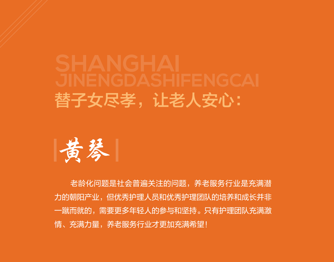 2003 年,黄琴从上海市第二社会福利院调至上海市第三社会福利院,从 护理孤残青年到护理老人,服务对象不同,护理重点各异,让初来乍到的她 深感理论知识的缺乏。在工作之余,黄琴潜心学习养老护理知识,刻苦钻研 操作技能。不久,她的努力获得了回报,黄琴先后获得了养老护理员中级、 高级及技师资格证书,并在上海乃至全国的操作技能大赛中屡获佳绩,成为 上海养老护理队伍中的佼佼者。