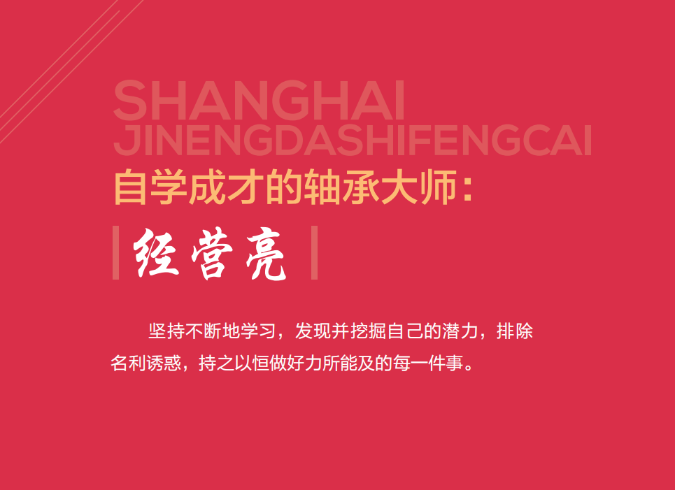 经营亮笑称自己“还没出生就跟轴承打交道了”。父母是 当年支援基础建设的技术工人,从上海到洛阳轴承厂。经营亮 上学读的是厂里的子弟学校,学工时就去车间里跟车床、轴承 打交道,刚上完高一就到湖北襄阳汽车轴承股份有限公司做了 一名普通的磨工,成了标准的子承父业。
