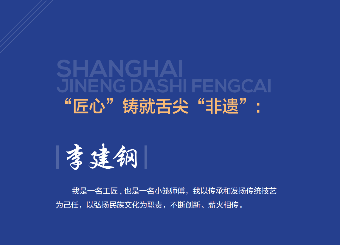为了把这一非物质文化遗产——南翔小笼更好地呈现给更多人,李建钢 表示,他既是一名“指挥员”,也是一名“战斗员”,他和他的团队始终坚 守在南翔小笼生产的第一线,保质保量为大家提供优质、安全的产品。