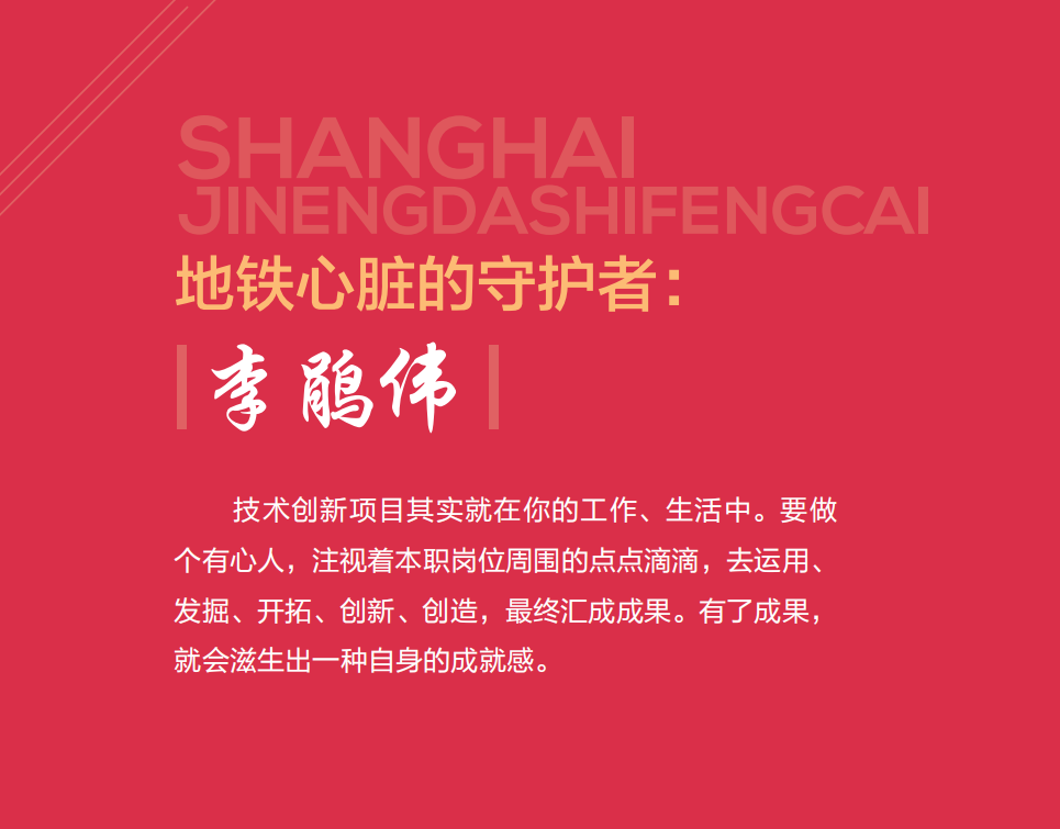 在我的“字典”中,“工匠精神”的“工”就是手工制作, 也就是技能、一技之长;“匠”就是利用这一技之长的技能, 不断创新、做到精致完美;“精神”就是爱岗敬业、勇于创新、 精益求精、无私奉献、传承、感恩、报答企业、报答社会。一 旦认准方向,就要做自己想要做的事,不求回报、低调做人、坦言相随。技术攻 关工作很多时候是 枯燥乏味、费时费 力的,一定要有毅 力、恒心。在轨道 交通网络化运营的 今天,确保安全运 营是我们所有地铁 人的目标,更是全 体乘客的期望。