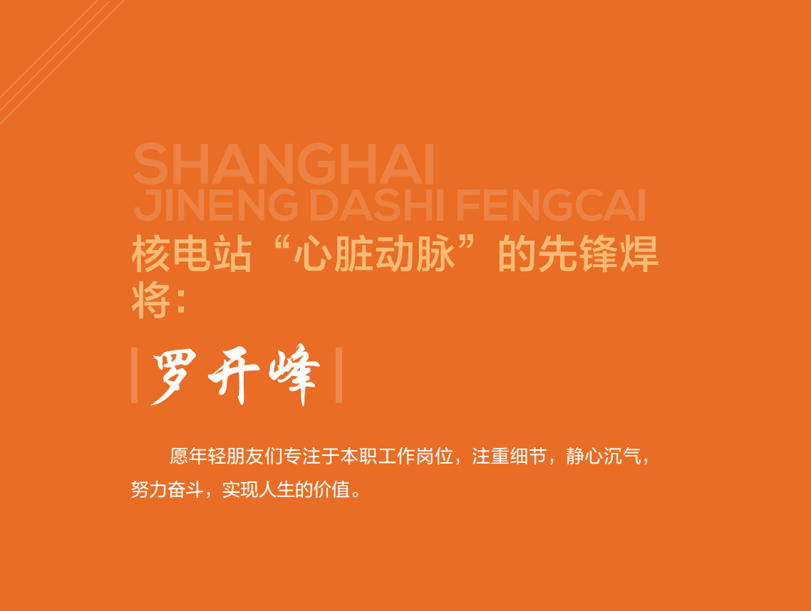 罗开峰是一名不折不扣的“核二代”,父亲曾是一家军工厂的一名管道 工。出生在四川的他,初中一毕业就跟随父亲来到上海,经过近 800 人的考试, 以优异成绩一步跨入了工程安装行业,毅然选择成为一名焊工。凭着那股不 服输的精神,跟着师傅刻苦练习焊接操作技能,参加工作的第二年,罗开峰 就凭借优秀的焊接技术夺得了公司青工技能大赛第一名。他手持焊枪,在核 电建设领域一干就是 20 多年,中间经历过多个技术难关,他都潜心钻研,一一破解。