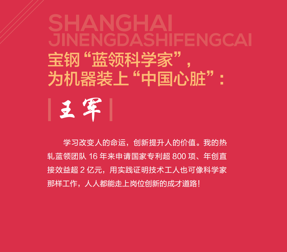 岁月荏苒,他还是他,一名最基层的工人。30 多年了, 他一直奔走在创新路上,从未止步,从未停歇。他用他的慧眼, 找出设备缺陷攻克点,改造,再改造。他用他的双手,破解世 界难题,创造,再创造!宝钢技能专家王军,带领他的团队, 用他们骄人的创新成果,无数次书写宝钢技术、中国制造。